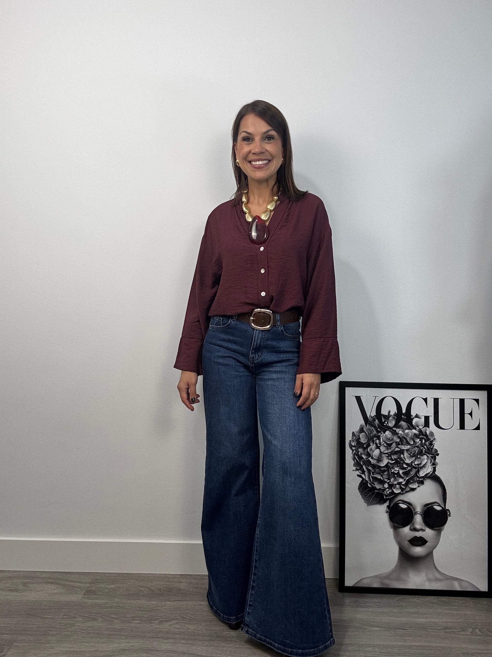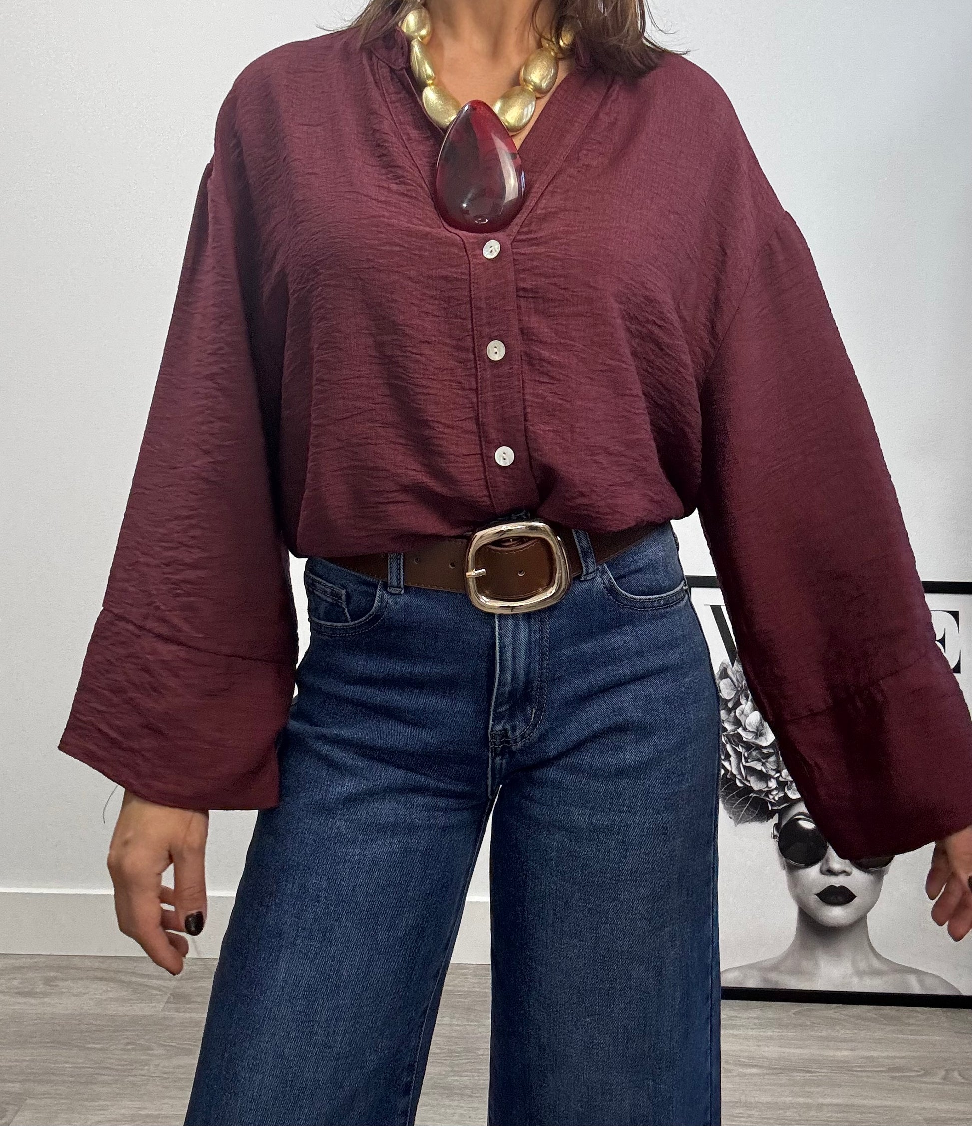 Esta camisa granate es la compañera ideal para construir un guardarropa que te haga sentir segura y radiante. Su escote estratégicamente diseñado realza tu figura de manera natural y favorecedora. Ya sea para el trabajo, una cita especial o un día casual, esta prenda te acompaña en cada momento, dándote la confianza de saber que luces impecable.