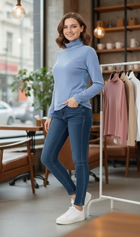 Camiseta térmica de manga larga con cuello subido que te mantiene abrigada sin renunciar al estilo. Su interior de felpa suave y cálida es perfecta para los días fríos, mientras que su diseño versátil te permite combinarla con prácticamente cualquier look.