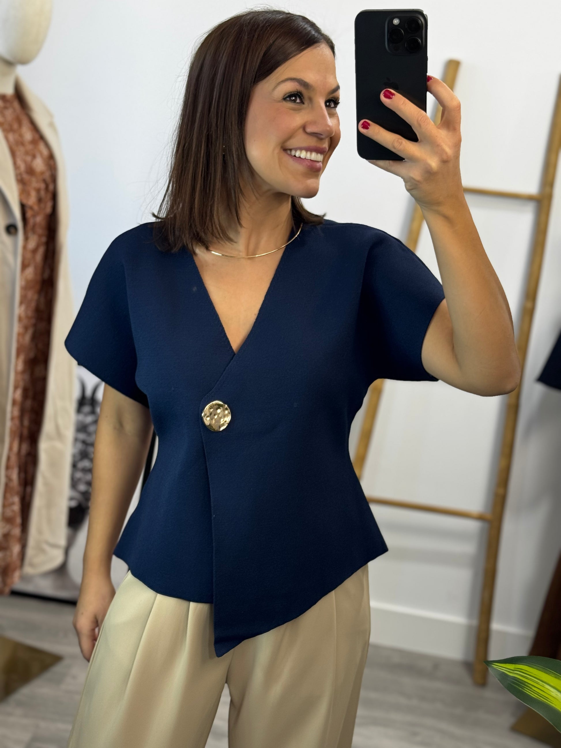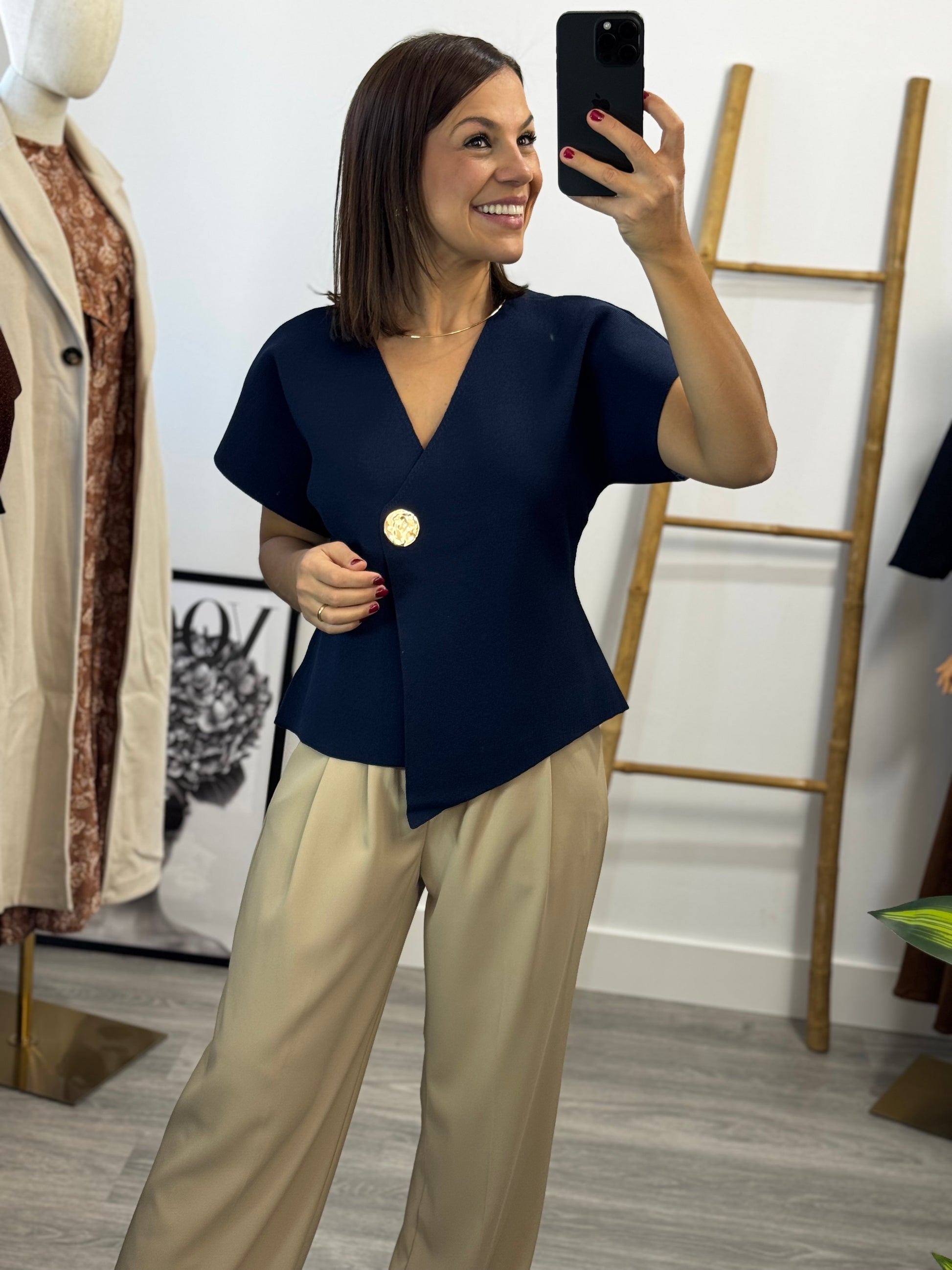 Chaleco de punto asimétrico que juega con líneas inesperadas y un toque de sofisticación. Su corte desigual crea movimiento y personalidad, mientras que el botón dorado añade ese detalle premium que eleva cualquier look. Perfecto para quien se atreve a romper la simetría y destacar con estilo moderno y desenfadado.