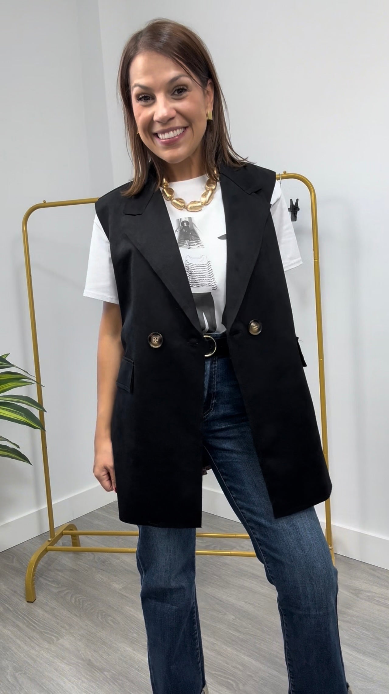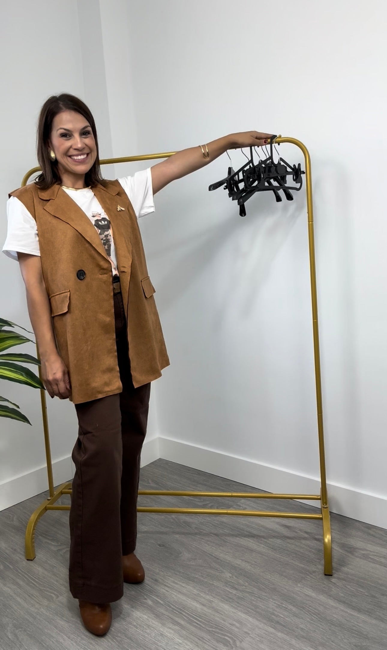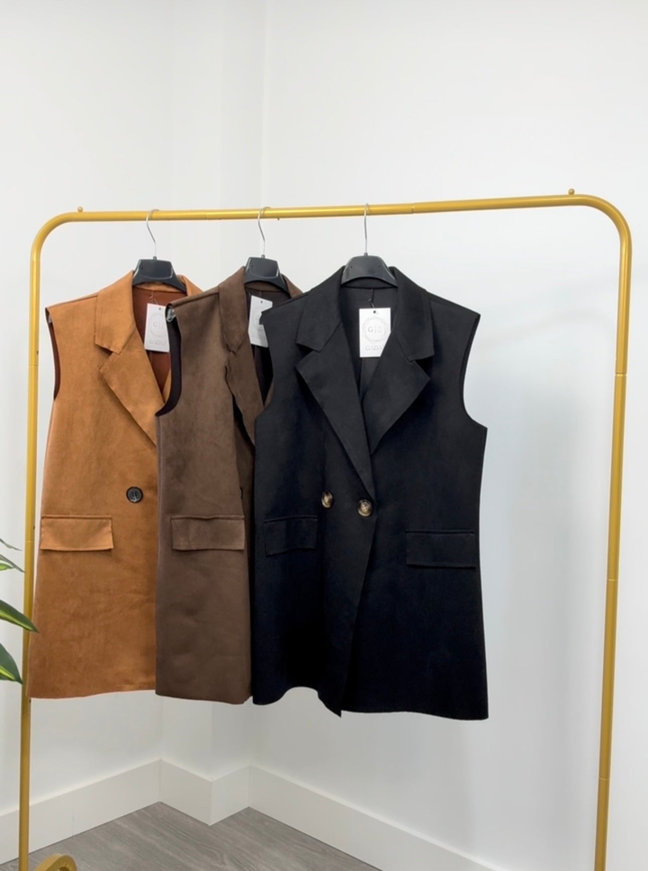 Chaleco estilo blazer sin mangas confeccionado en ante. Disponible en talla única, adaptable desde una S hasta una XL.