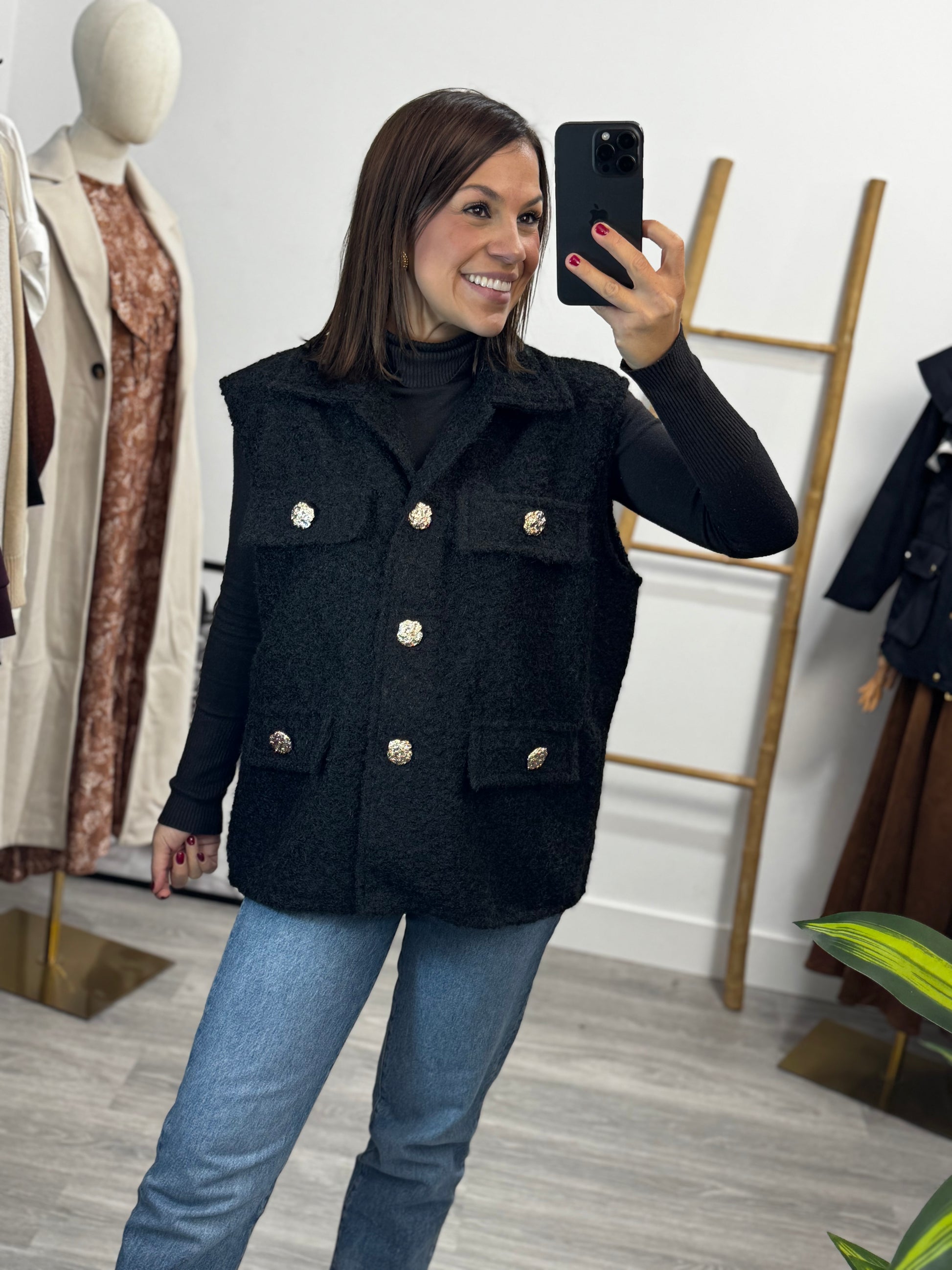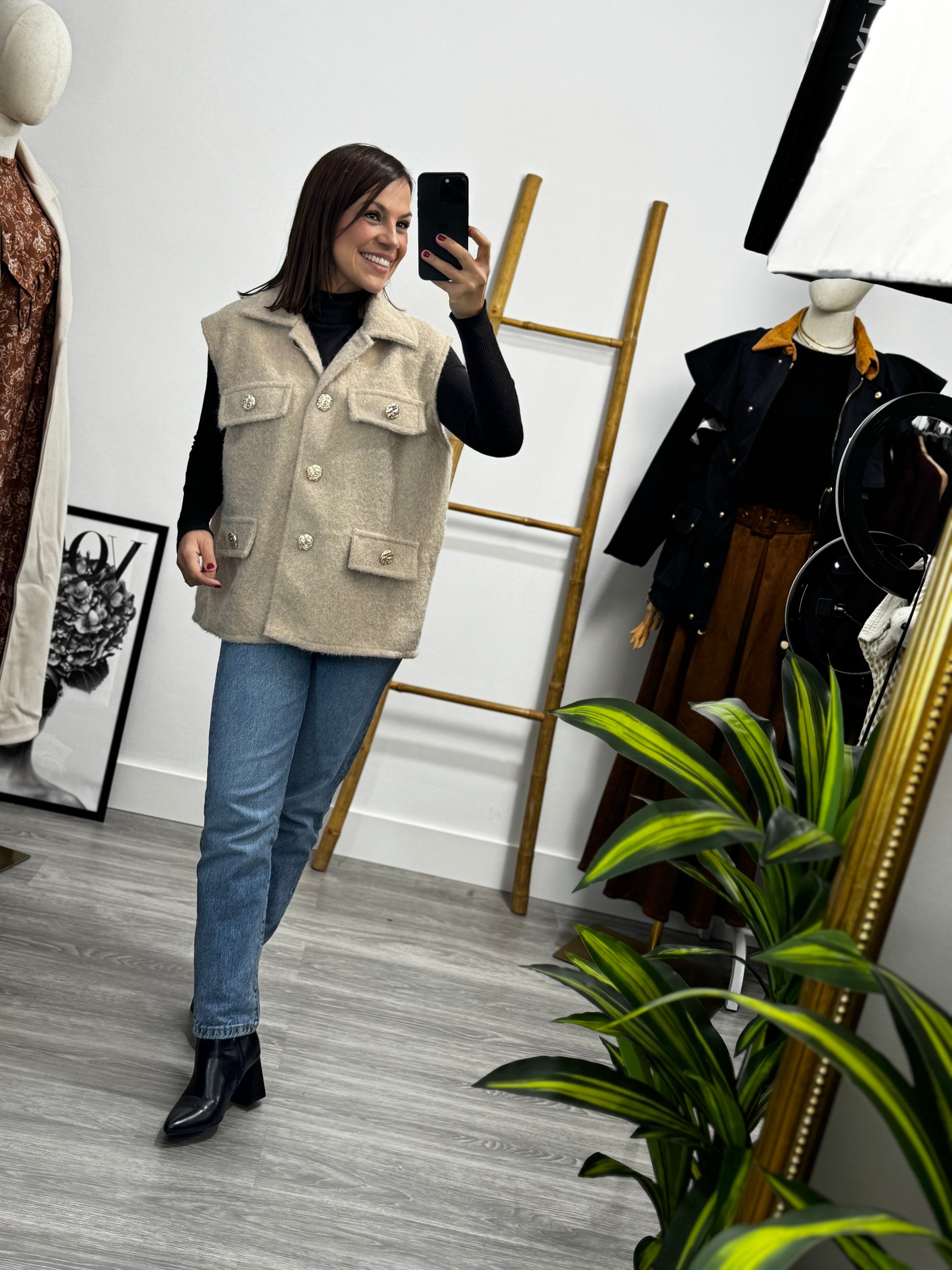 Es un chaleco con botones en dorado que hace del chaleco más bonito! Tiene un punto muy suave. Es talla única pero da talla desde una S hasta una XL …