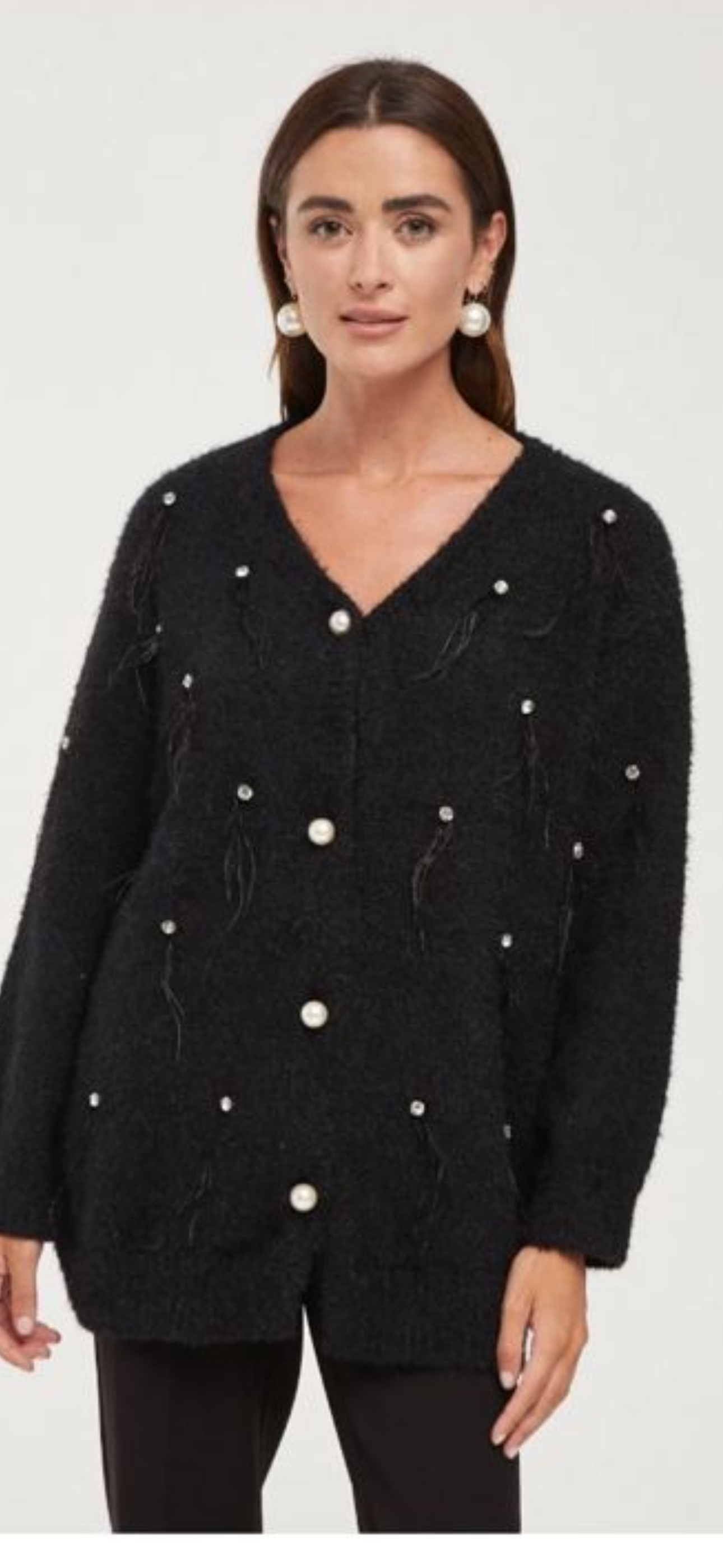 Chaqueta de punto con botones de perlas, y joyitas con pluma. Es una chaqueta muy elegante y versátil. Talla única , da talla desde una S hasta una XL
