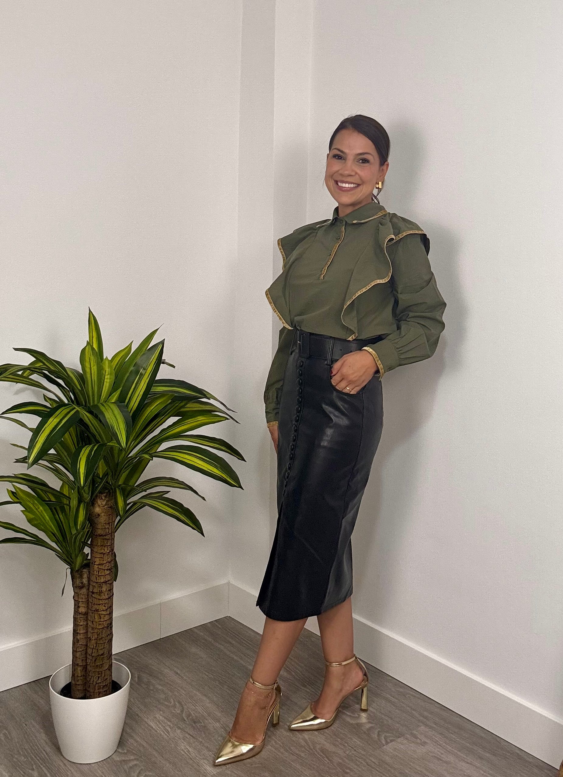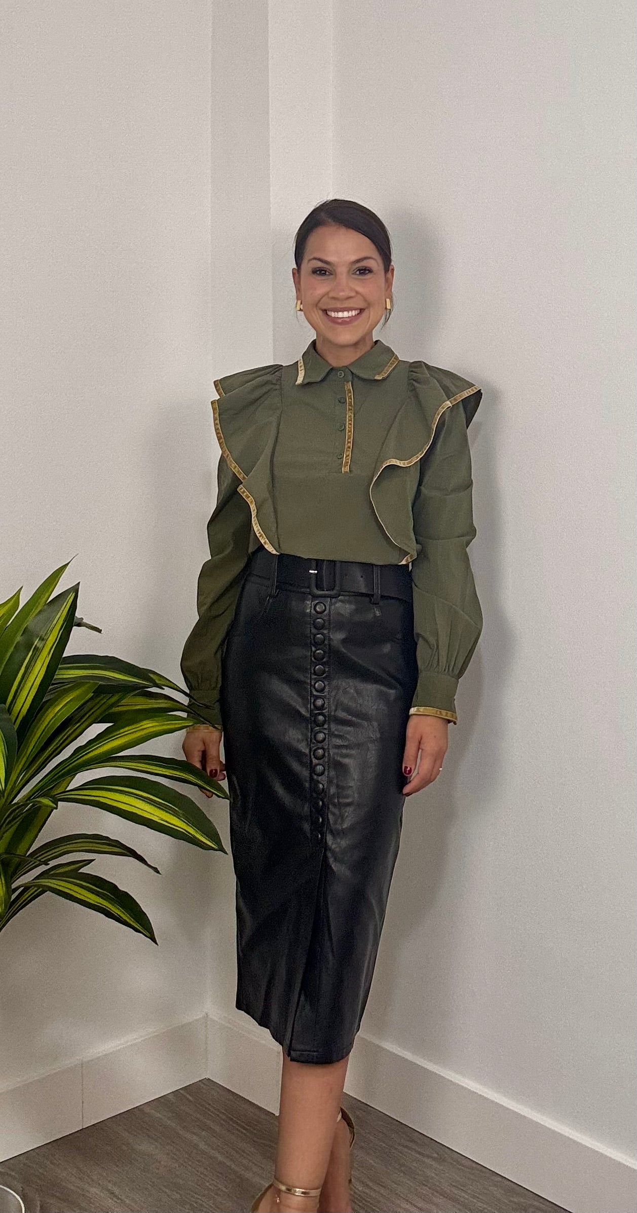 Falda negra polipiel de tubo con botones delanteros , bolsillos y cinturón. cremallera en la parte trasera.