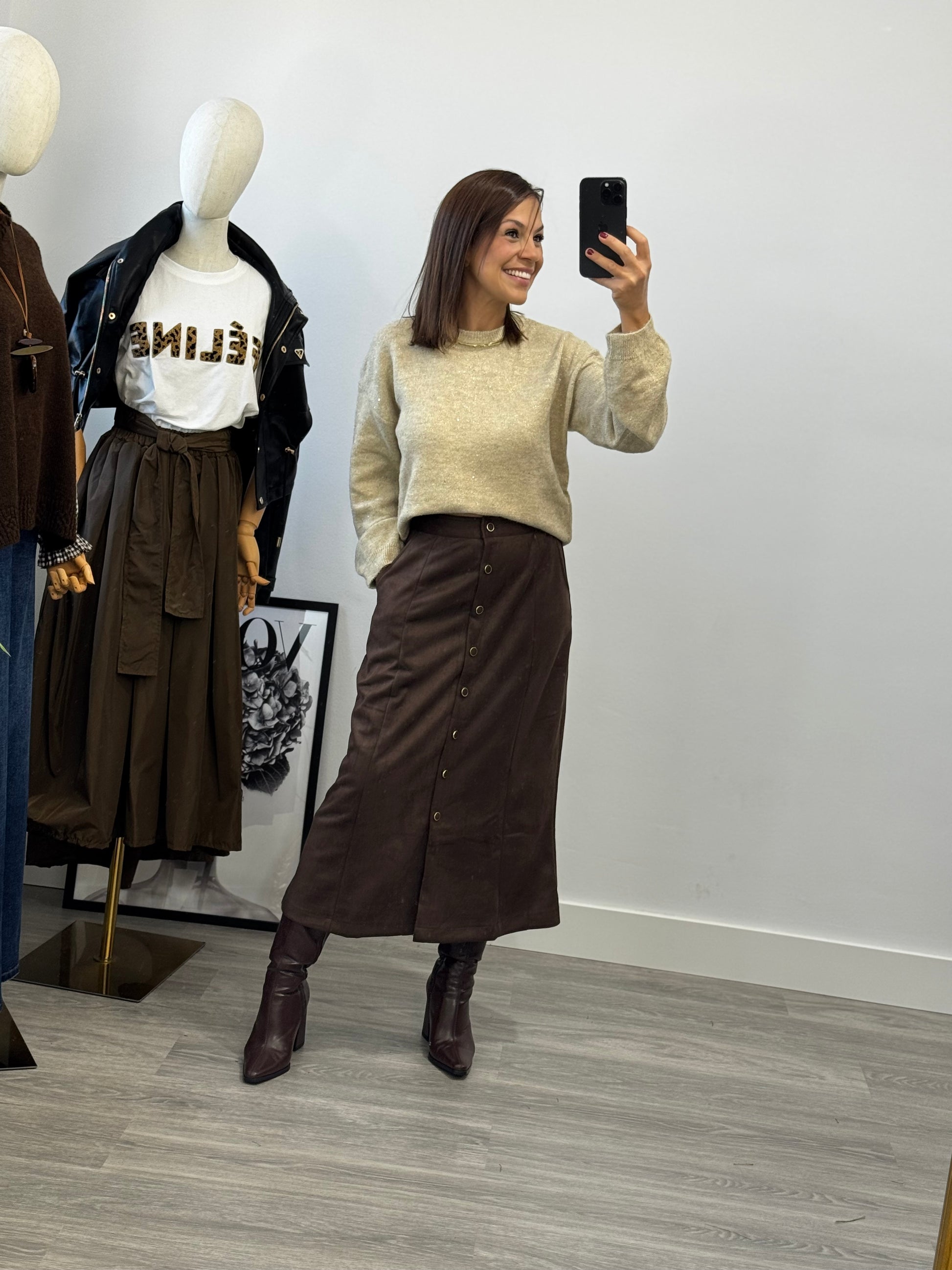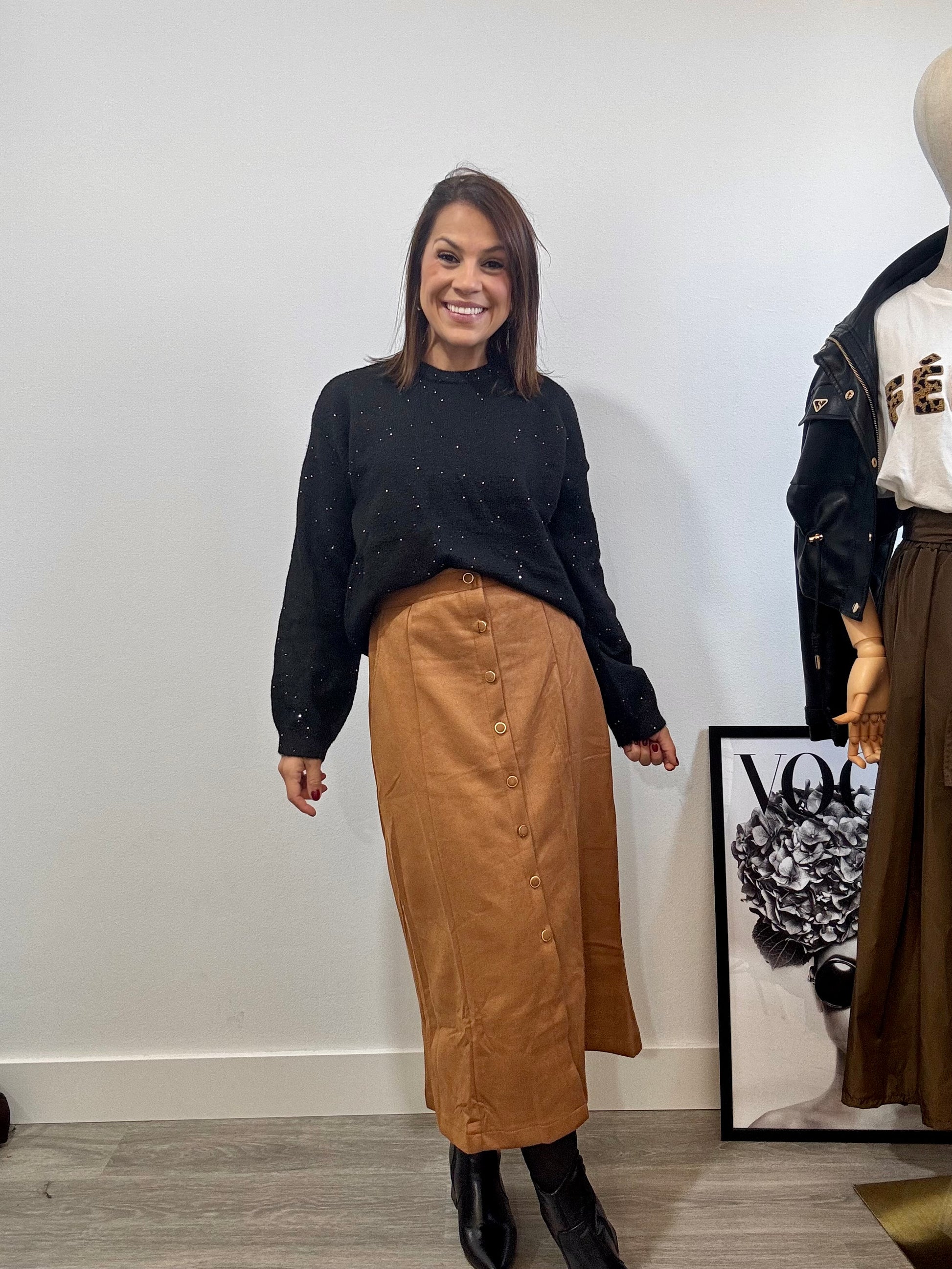 Su tejido de punto suave con pequeños brillos integrados lo convierte en la opción perfecta para elevar cualquier look sin perder comodidad.