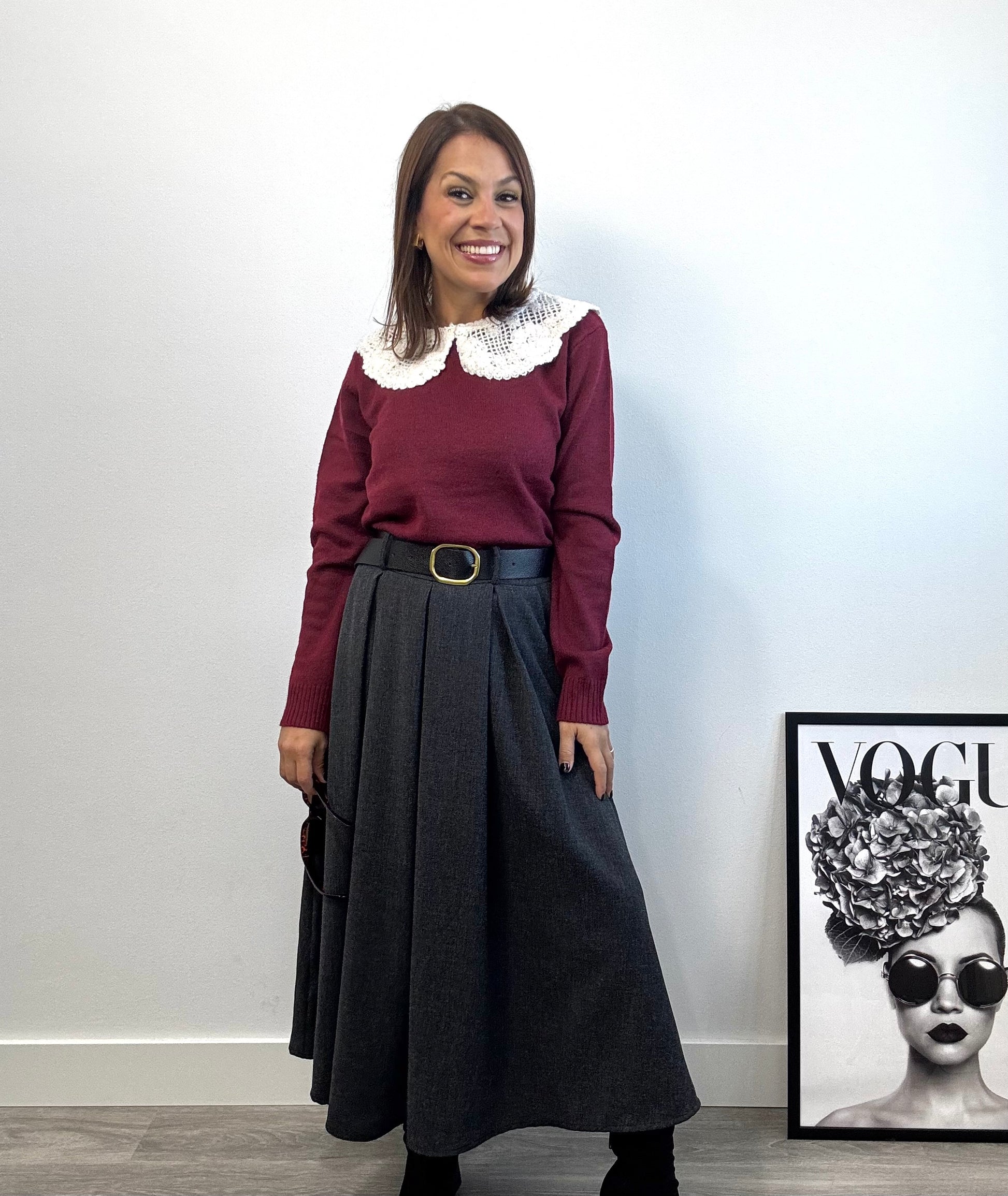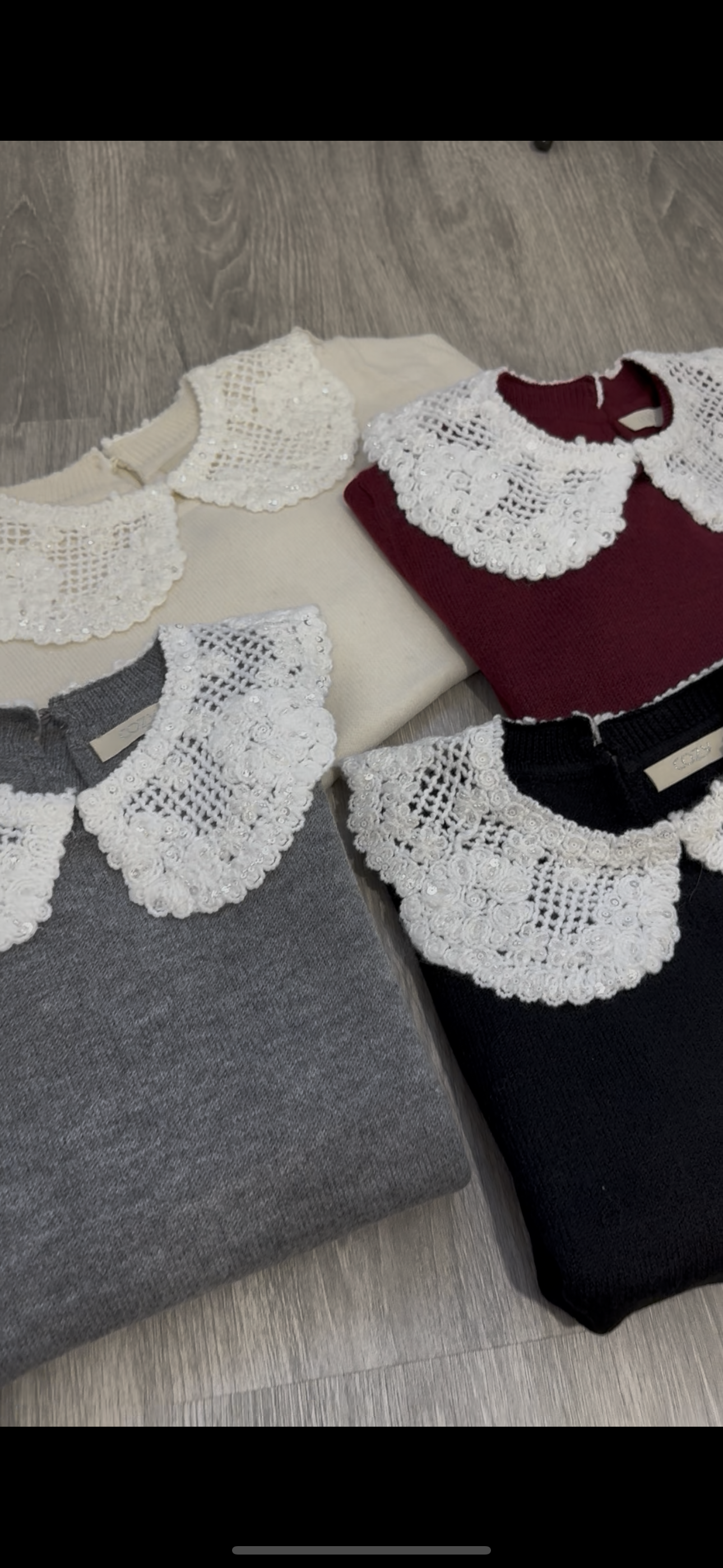 Su distintivo cuello de encaje añade un toque femenino y delicado, mientras que los detalles sutiles de lentejuelas del mismo color crean un efecto luminoso sin resultar excesivo.