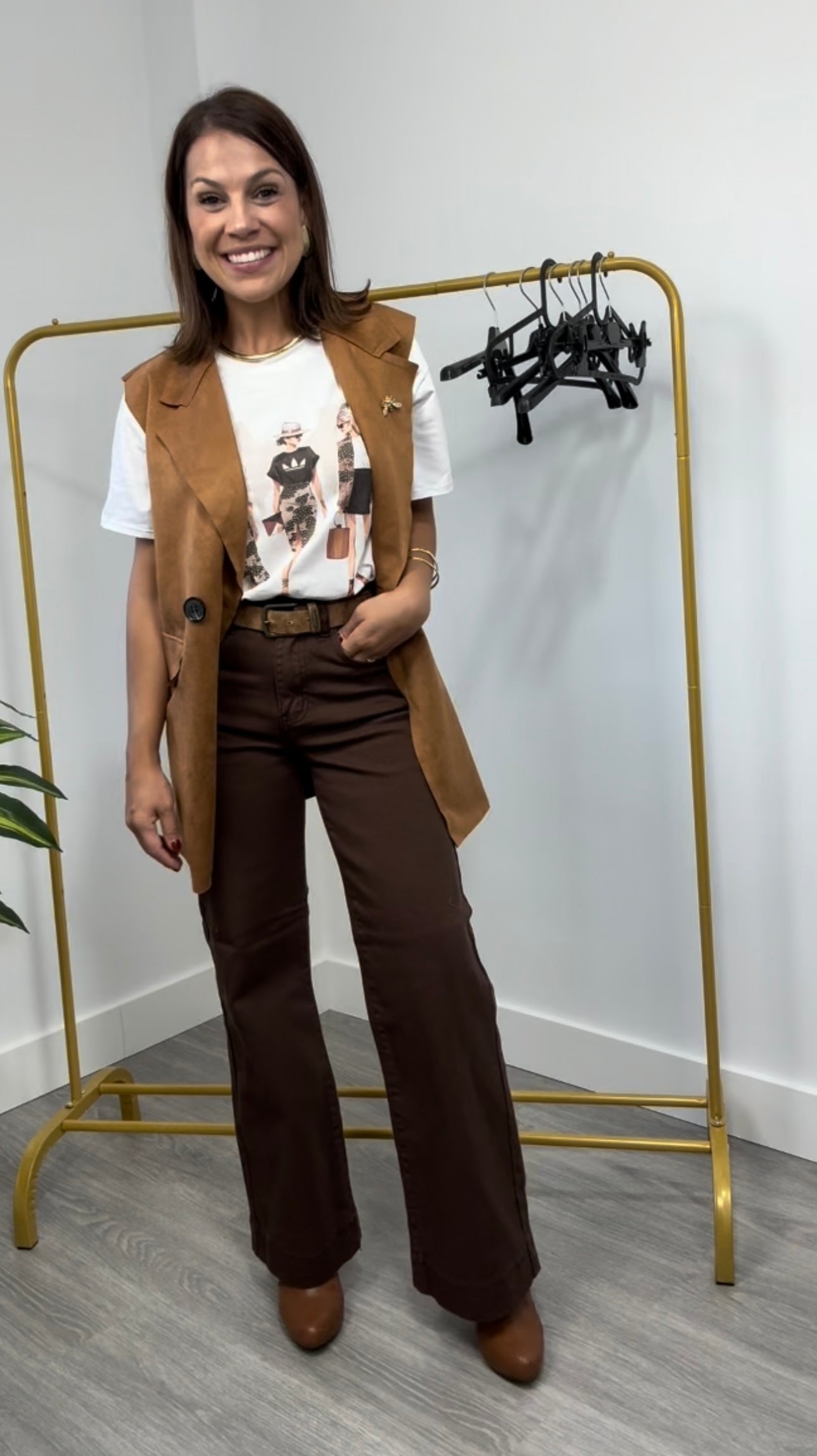 Nuestro pantalón marrón chocolate combina comodidad y estilo en una prenda versátil. Confeccionado en un tejido resistente y suave al tacto, ofrece un ajuste favorecedor gracias a su corte recto con ligera amplitud en el bajo. Ideal para looks casuales o para elevar con blazer y botines.