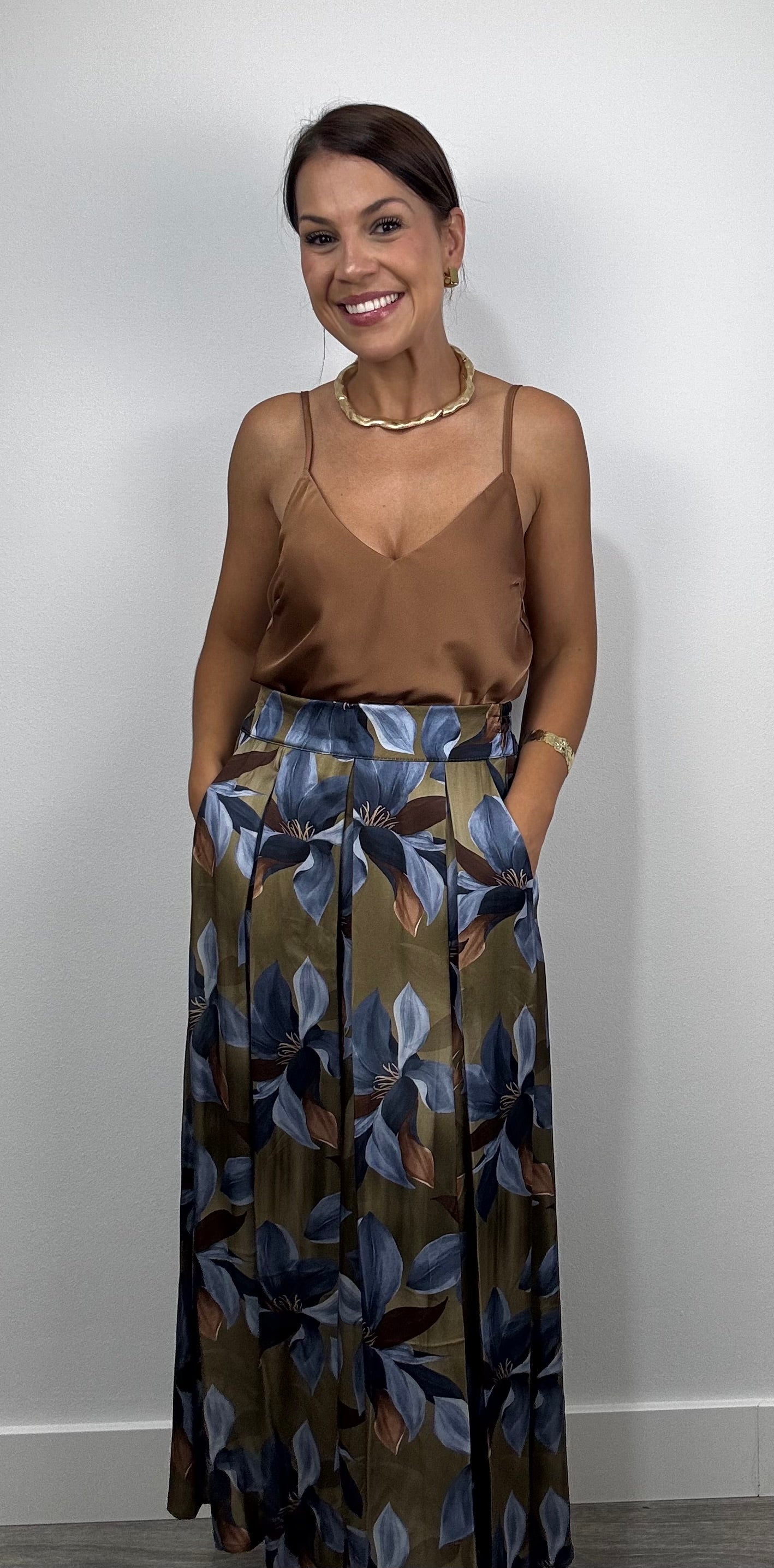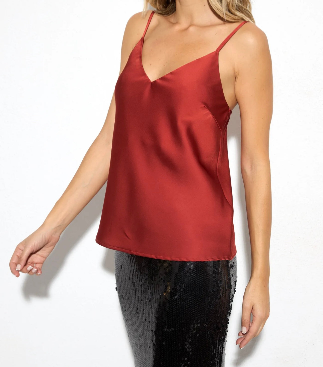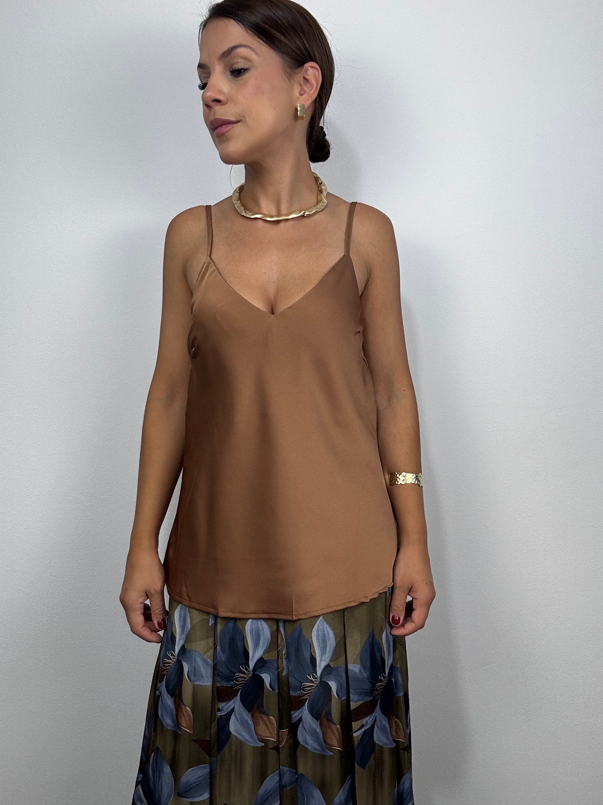 Top femenino de tirantes finos confeccionado en tela satinada de acabado suave y elegante. Su diseño de escote en V estiliza la silueta, aportando un toque sofisticado y versátil. Ideal para combinar con faldas o pantalones, perfecto tanto para looks de noche como para un outfits más casuales con un blazer o chaqueta ligera.
