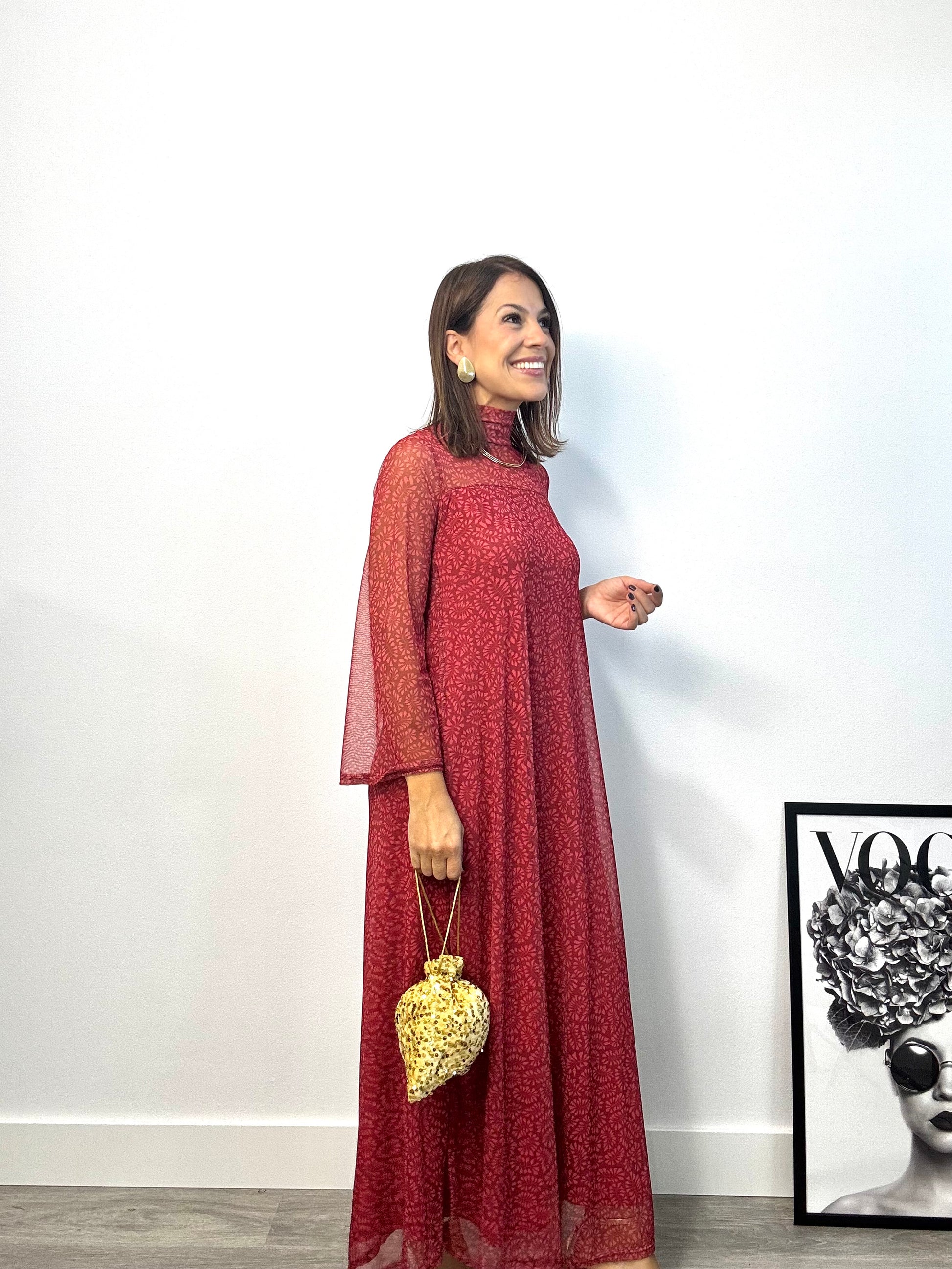 Vestido de caída recta confeccionado en tela fluida con estampado distintivo. Destaca por sus mangas largas y detalles transparentes en hombros y puños elaborados en tul delicado, creando un efecto sofisticado y etéreo. El volumen generoso de la prenda proporciona comodidad y movimiento, mientras que la combinación de tejidos opacos y transparentes añade profundidad visual al diseño. Ideal para ocasiones que requieren elegancia con un toque contemporáneo.