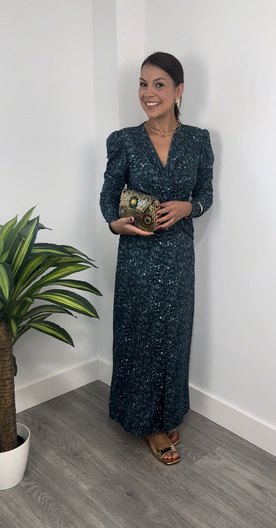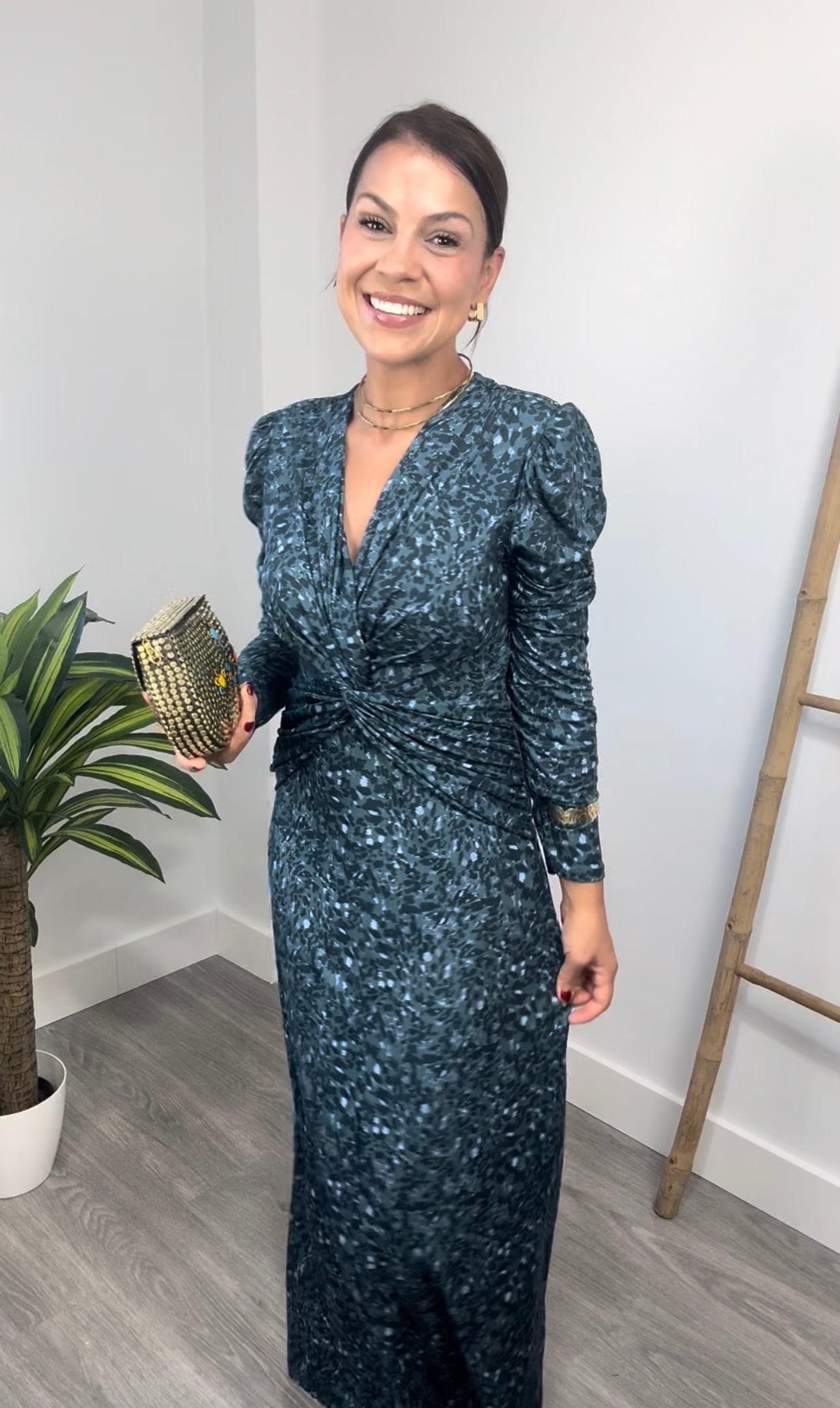 Vestido de manga larga , con un estampado abstracto moteado. El diseño tiene un escote en V cruzado y un detalle fruncido en la cintura que crea un efecto drapeado favorecedor. El tejido es ligero y fluido, ideal para un look elegante pero cómodo.